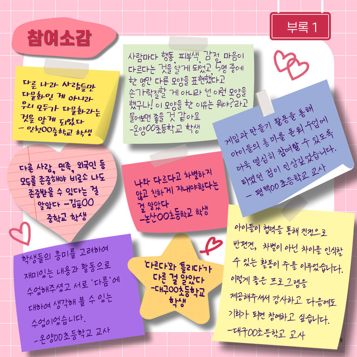 - 사람마다 행동, 피부색, 감정, 마음이 다르다는 것을 알게 되었고 5명 중에 한 명만 다른 모양을 표현했다고 손가락질할 게 아니라 '넌 이런 모양을 했구나! 이 모양을 한 이유는 뭐야?'라고 물어보면 좋을 것 같아요 - 온양00초등학교 학생