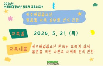 | Lecture materials | 사업자등록증(이주배경청소년지원재단).pdf (17,408byte) 이주배경청소년지원재단 통장사본(실무자과정).pdf (17,408byte) [배포] 2026년 이주배경청소년 유관기관 실무자 교육과정(4차) 안내_수정.hwp (17,408byte) | ||