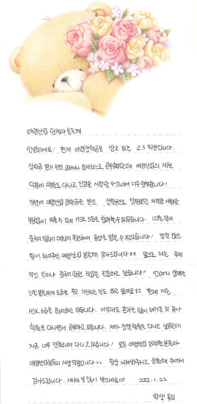 이주배경청소년지원재단(이사장 차윤경)은 애경산업에서 장학금 지원을 받는 이주배경청소년 장학생들의 감사손편지를 지난 1월부터 받아오고 있다.