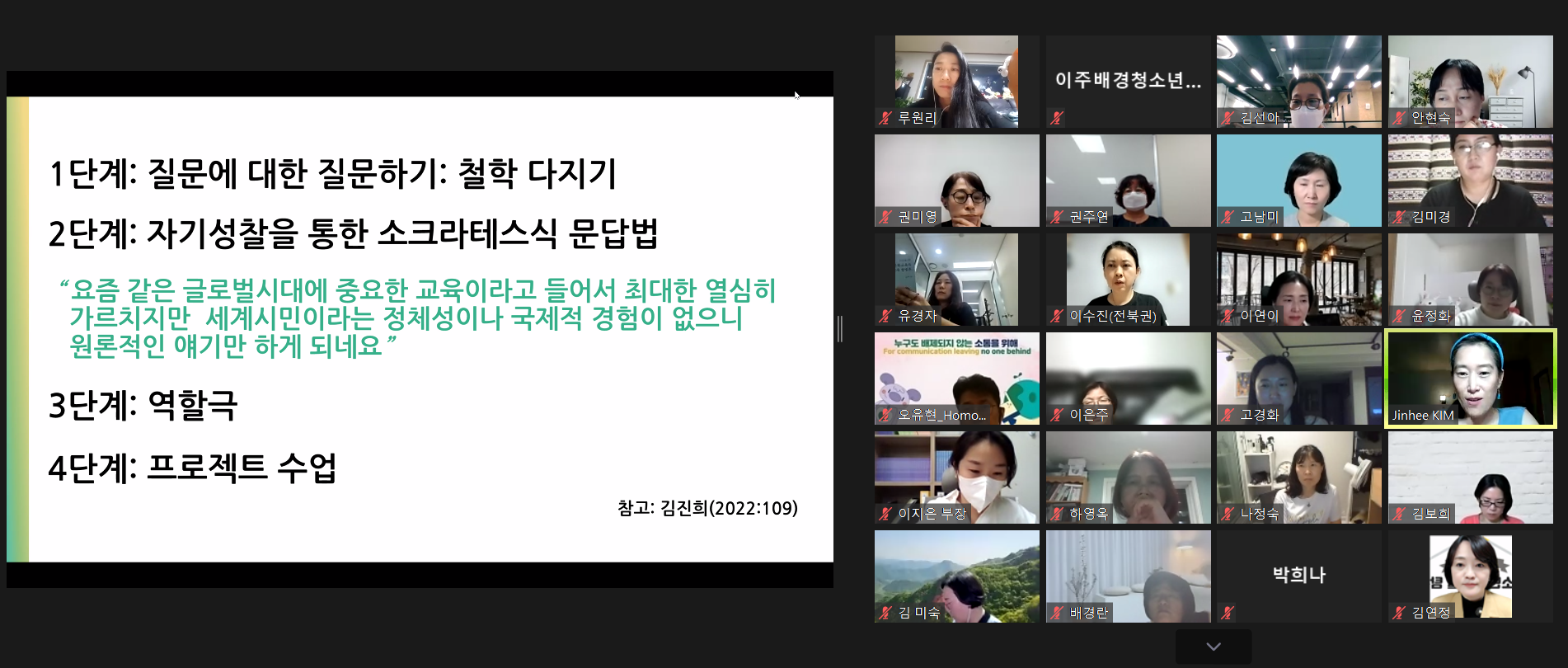 김진희 교수는 다문화교육과 세계시민교육의 이론적 차이를 시작으로 하여 실제적 공통성, 각 교육의 위치, 교육자로서 주체적으로 이해하고 소통할 수 있는 역량의 중요성에 대해 강조하였다. 교육 현장의 중심에서 학습자들과 소통하고 상호작용을 하며 학습의 변화를 이끌 수 있는 다양한 교수법(포용주의 교수법, 프로젝트 기반학습 등)을 소개하였다. 활동으로는 ‘어린이가 인식하는 인종차별’ 동영상을 시청하고 교육자 역량 강화 실습을 진행하였다. 참여한 다가감 강사들은 매우 진지하고 적극적으로 활동에 임했고, 교육자로서 철학적으로 성찰하는 시간을 가졌다.