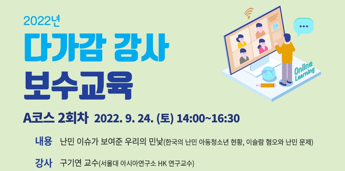 A코스 2회차는 9월 24일(토)에 '난민이슈가 보여준 우리의 민낯(한국의 난민 아동·청소년 현황, 이슬림 혐오와 난민 문제)'이라는 제목으로 구기연 교수(서울대 아시아연구소 HK교수)가 진행하였다.