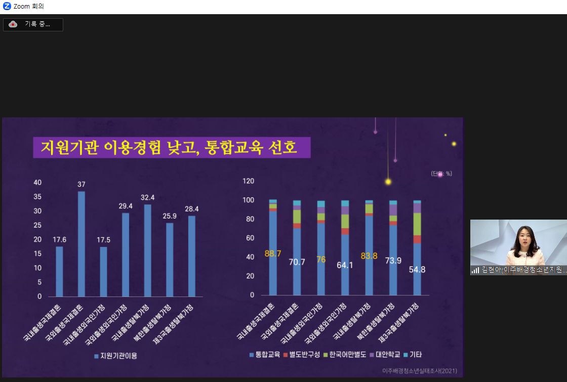 이주배경청소년의 개념부터 이들을 지원하기 위한 프로그램(레인보우스쿨, 상담, 다문화감수성 프로그램 '다가감')에 대한