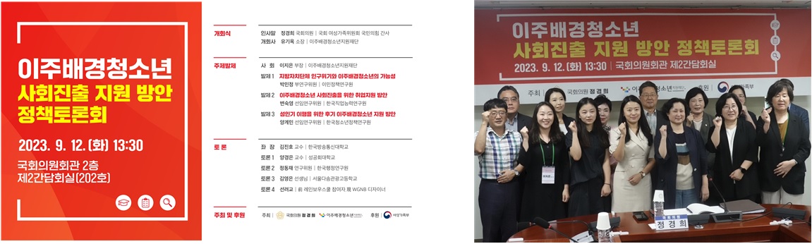 이주배경청소년지원재단(소장 유기옥)은 지난 9월 12일, 여성가족위원회 국민의힘 간사를 맡고 있는 정경희 의원실과 함께 ‘이주배경청소년 사회진출 지원 방안’을 주제로 정책토론회를 개최했다.