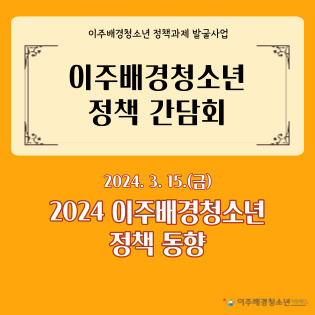 이주배경청소년 관련 이슈를 발굴하고, 정책을 논의하기 위해 간담회를 개최합니다. 이주배경청소년들이 건강한 사회 구성원으로서 성장할 수 있도록 여러 전문가들의 의견을 들을 예정입니다. 어떤 이야기들이 논의됐는지는 5월 호에서 만나요🖐🖐 |