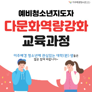 이주배경청소년의 정착과 성장을 위해 지역사회 인적자원을 양성하고 있습니다. 이주배경청소년 이해와 다문화 현장의 실제, 지원활동가를 양성 등 다양한 교육이 담겨있습니다! 이주배경청소년 지원 및 다문화 교육에 관심있는 대학(원)생들은 많은 참여바랍니다🤗 |
