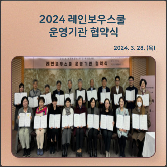 4월 1일부터 레인보우스쿨이 시작되었습니다! 전국 21개소의 운영기관이 레인보우스쿨을 실시하고 있는데요, 3월 28일(목), 재단과 레인보우스쿨 운영기관 간 업무협약식을 통해 교육지원사업에 대한 공동의 의지를 다지는 시간을 가졌습니다. 앞으로 진행될 새로운 레인보우스쿨 기대해주세요⭐ |