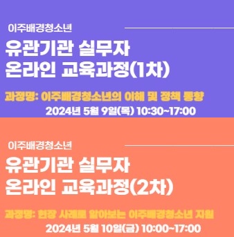 5월 9일~10일, 이주배경청소년 유관기관 실무자들을 대상으로 온라인 교육을 진행할 예정입니다. 이주배경청소년 관련 업무 전문성을 제고하는 목적과 더불어 인식개선을 위한 다문화감수성 이해, 사례학습을 통한 실무자들의 전문 실무 역량을 강화하는 시간을 가질 예정입니다. 이주배경청소년들을 위해 발로뛰는 실무자들을 많이 응원해주세요🤩 |