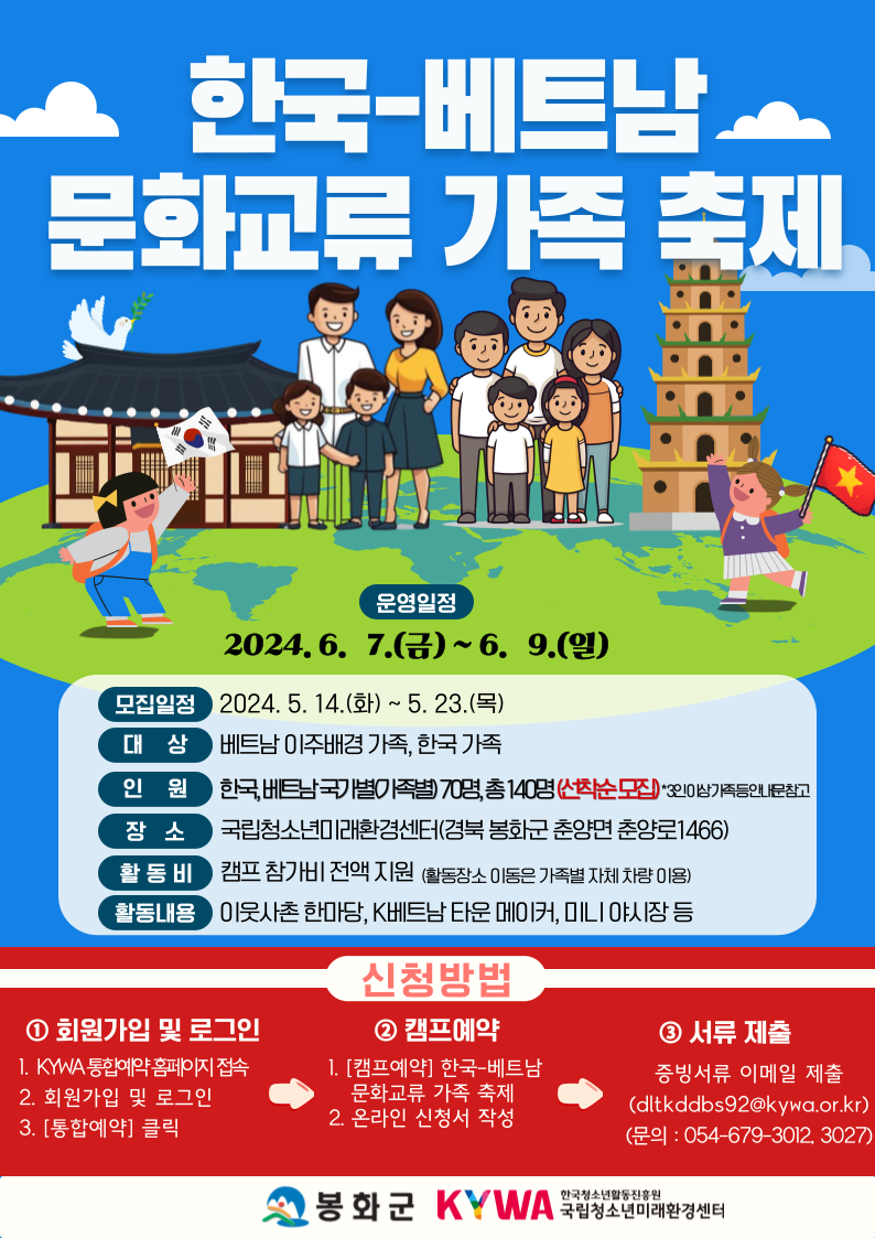 한국청소년활동진흥원 국립청소년미래환경센터와 봉화군청은 한국과 베트남 간의 교류 활성화를 위해 「2024 한국-베트남 문화교류 가족축제」를 진행할 예정입니다.