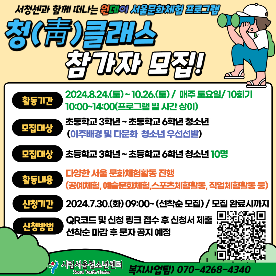 청클래스는 서울문화체험활동 프로그램으로 청소년들의 문화적응을 위한 다양한 체험활동을 할 수 있는 체험활동입니다!(이주배경 및 다문화 청소년 우선 선발)