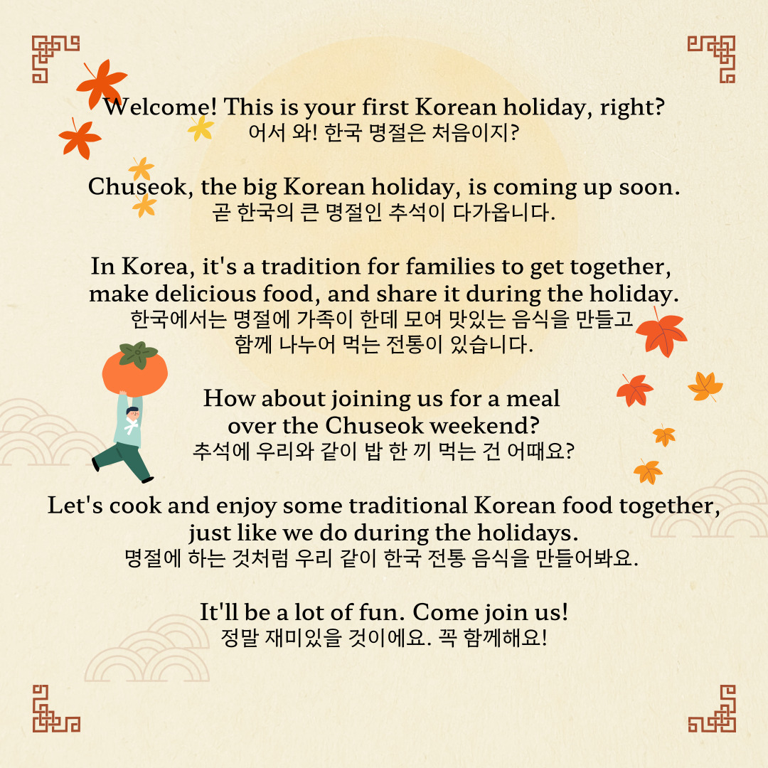 How about joining us for a meal over the Chuseok weekend? Let’s cook and enjoy some traditional Korean food together, just like we do during the holidays.