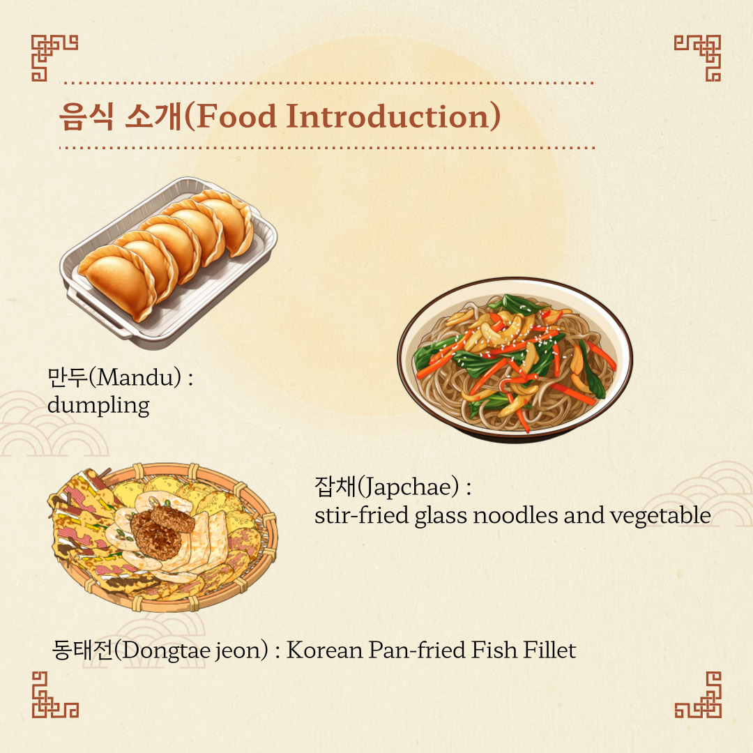 - 한국의 명절 전통 음식 만두, 잡채, 동태전을 함께 만들고 나누어 먹기