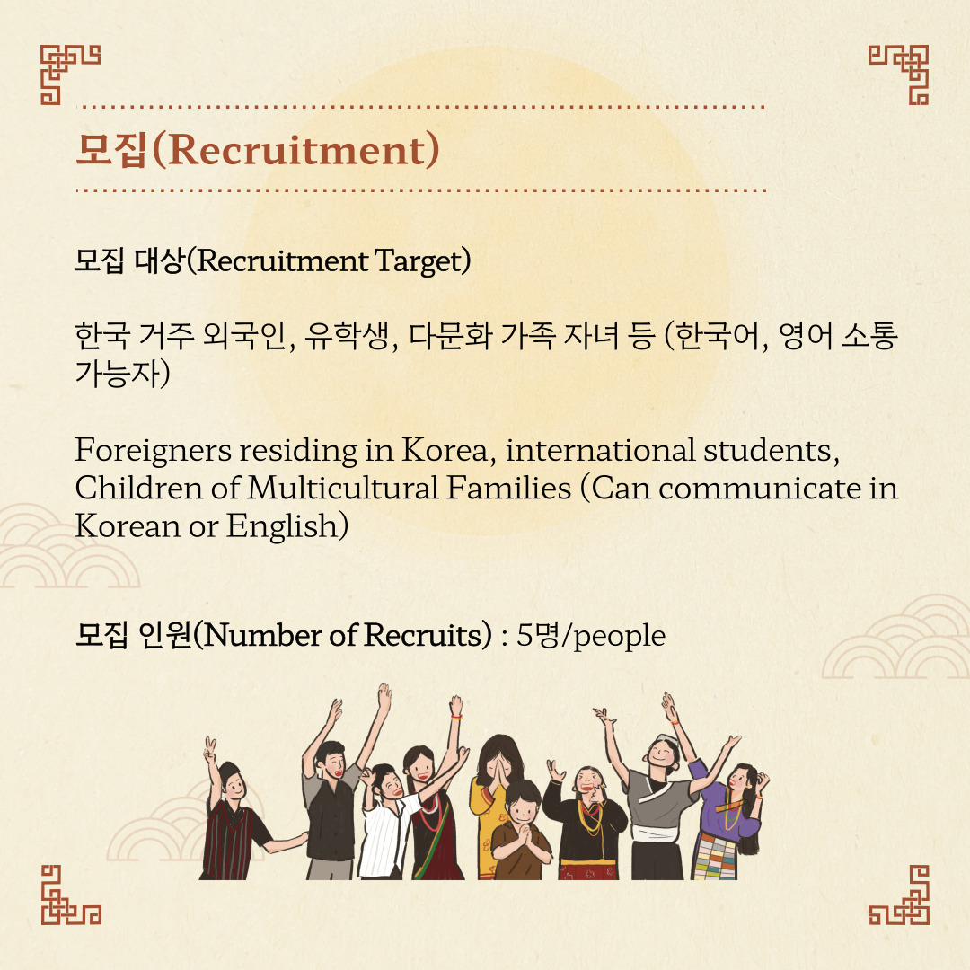 - Foreigners residing in Korea, International students, Children of Multicultural Families (Can communicate in Korean or English)