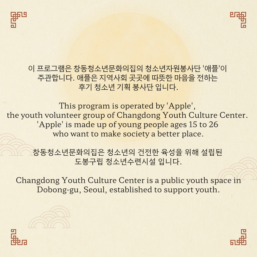 이 프로그램은 창동청소년문화의집의 청소년자원봉사단 애플이 주관합니다. 애플은 지역사회 곳곳에 따뜻한 마음을 전하는 후기 청소년 기획봉사단입니다.