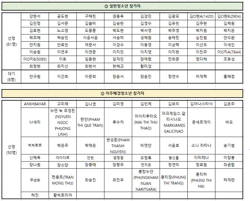 ★ 선정 및 대기 청소년 명단은 가나다순으로 나열되었습니다.