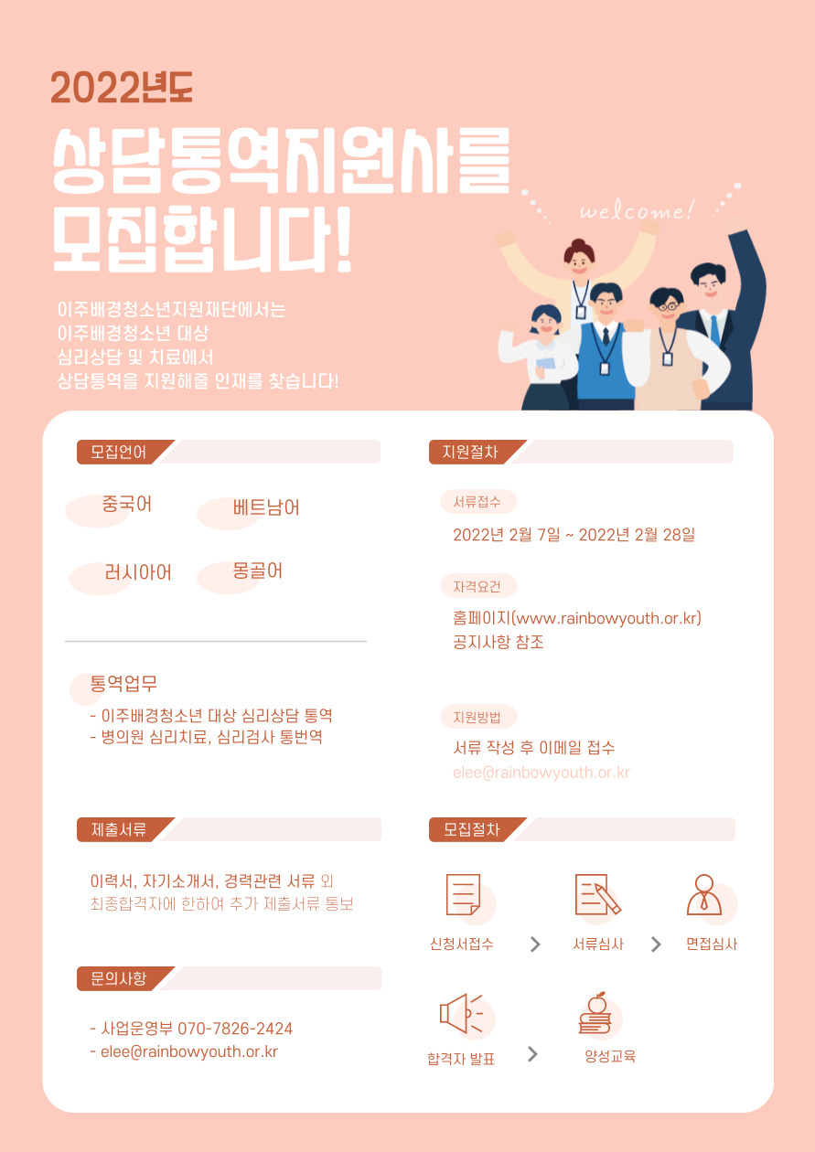 2022년도 상담통역지원사를 다음과 같이 모집하오니, 적극적인 참여바랍니다.
