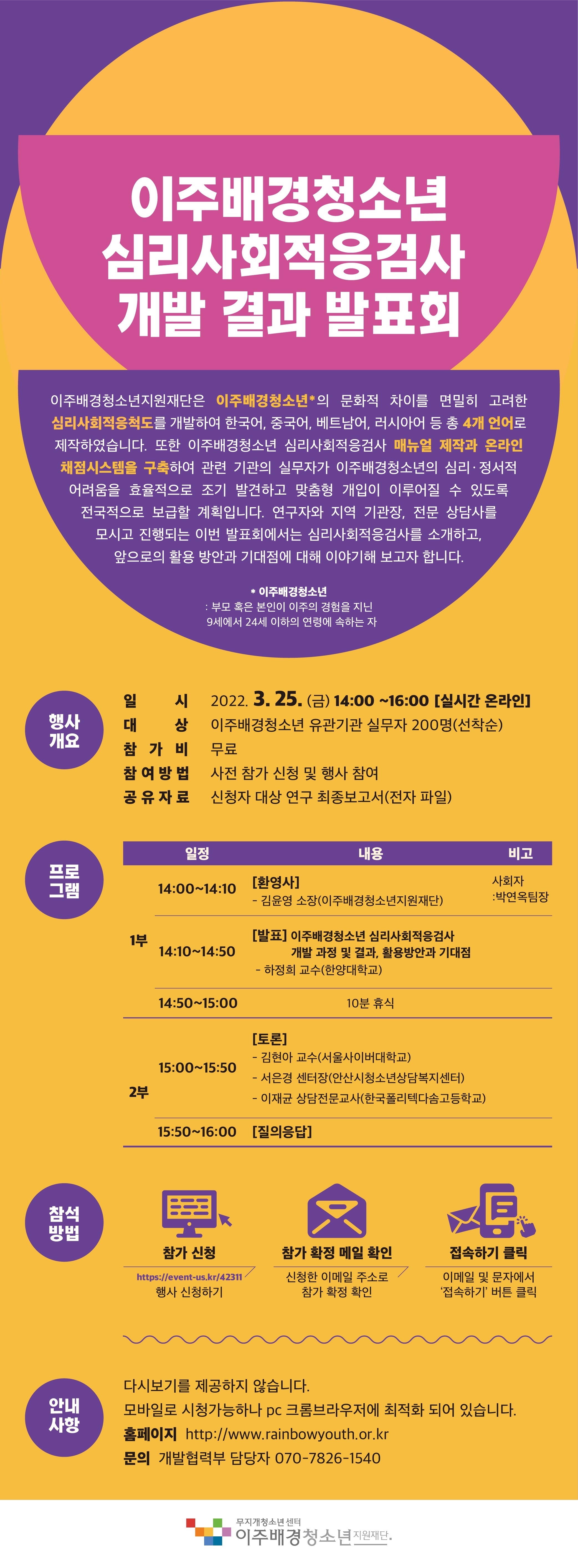 이주배경청소년지원재단에서는 이주배경청소년 심리사회적응검사 개발 결과 발표회 참가자를 모집하오니