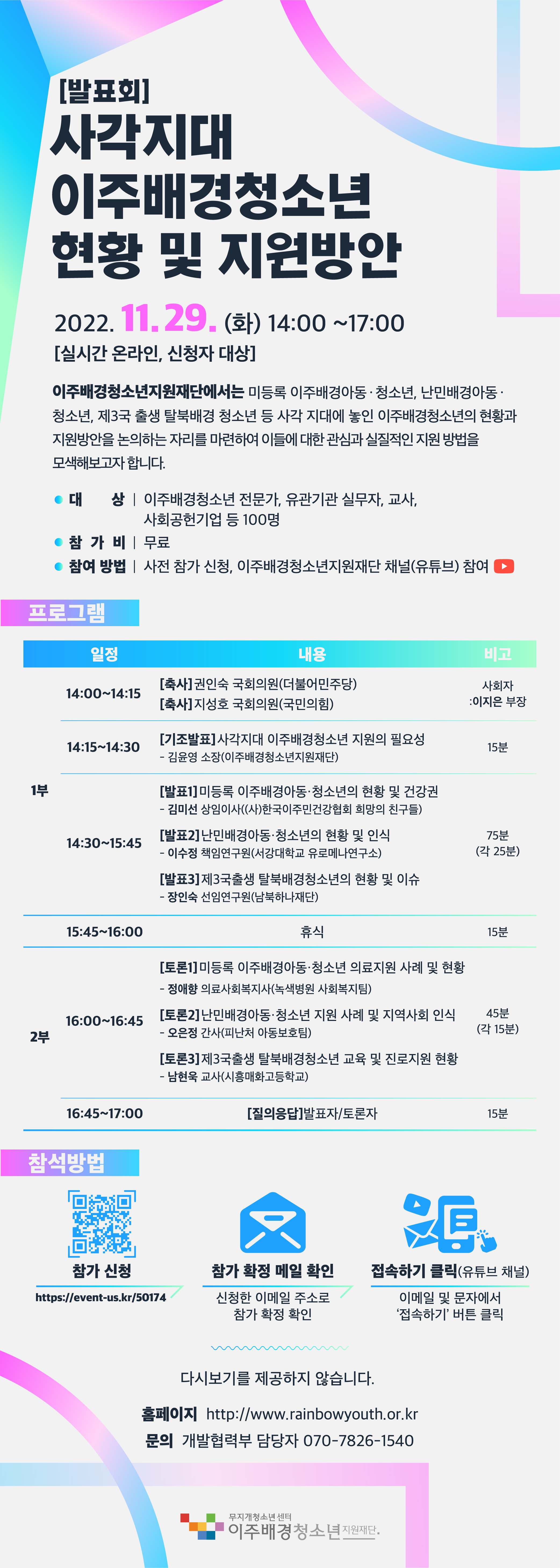 이주배경청소년지원재단에서는 「사각지대 이주배경청소년 현황 및 지원방안」 발표회 참가자를 모집하오니