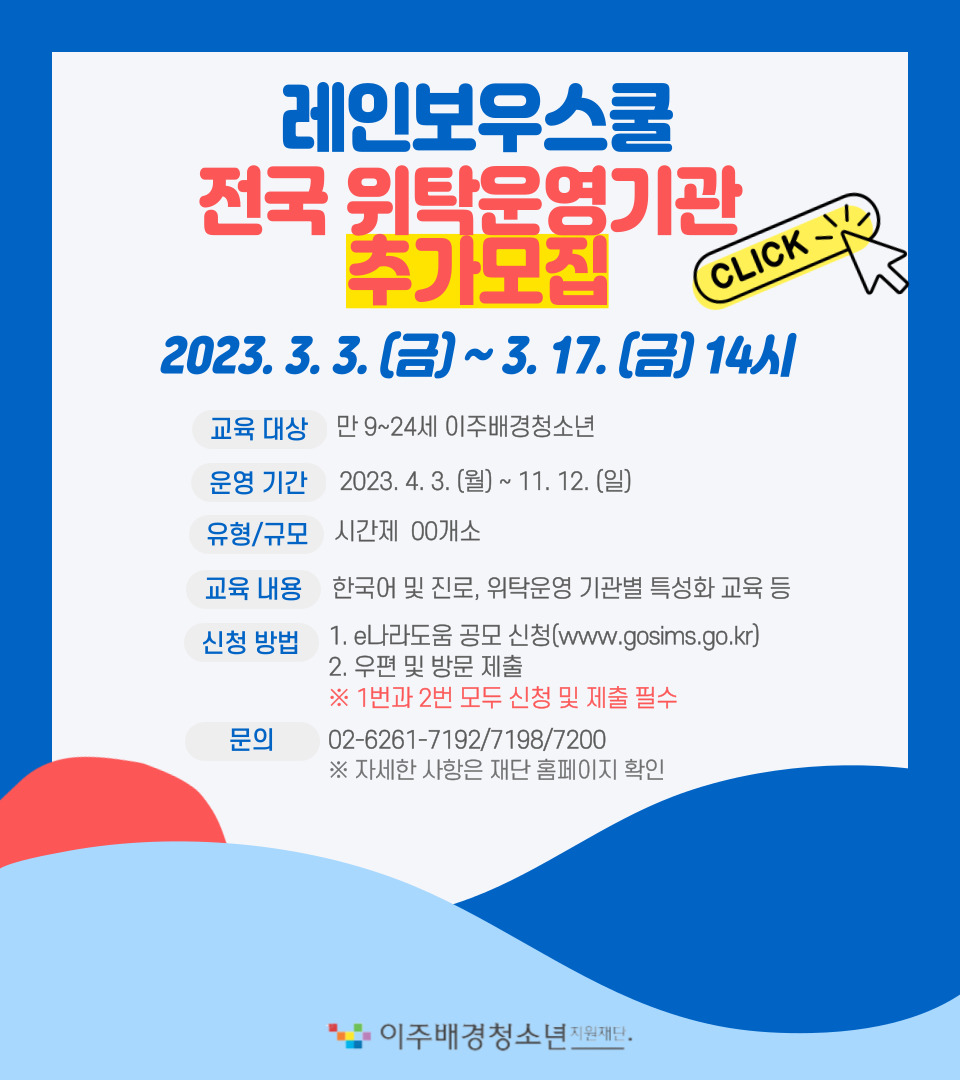 2023년 이주배경청소년 교육지원사업 '레인보우스쿨' 위탁운영 기관 추가모집 공모